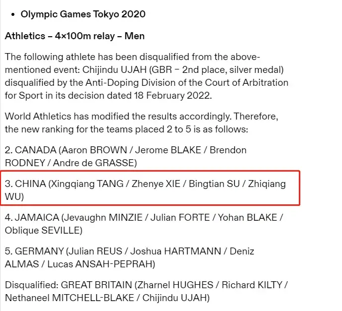 国际体育仲裁法庭(CAS)今年2月18日发布公告,认定英国短跑运动员奇金杜·乌贾在东京奥运会期间违反了反兴奋剂条例,英国队在东京奥运会男子4×100米接力决赛中获得的银牌被剥夺。加拿大队递补获得银牌,中国队递补获得铜牌。这也是中国男子4×100米接力队在奥运会上获得的首枚奖牌。